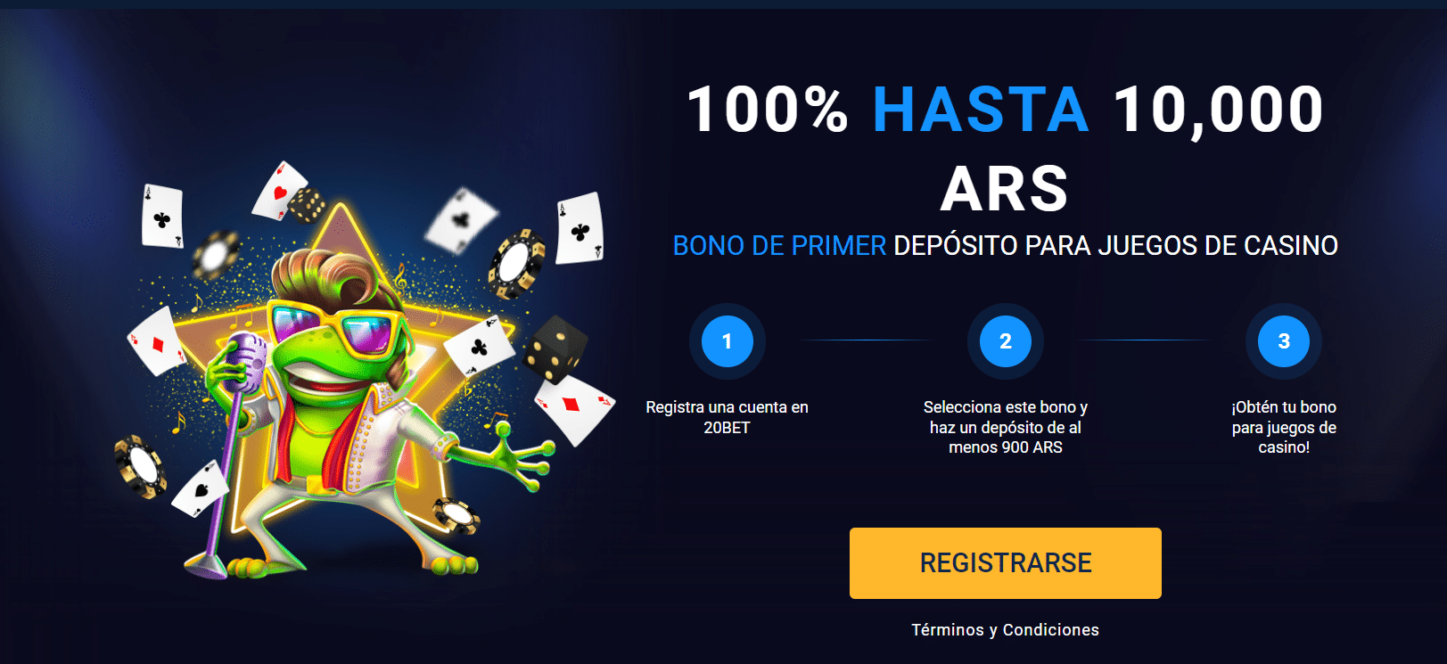 Bajo el nombre de bono de bienvenida se cuenta con el codigo promocional 20bet Argentina. Este ofrece un 100% de beneficio sobre el primer depósito en la plataforma de hasta $10.000 ARS. Puedes aplicarlo tanto en la sección deportiva como en la del Casino.