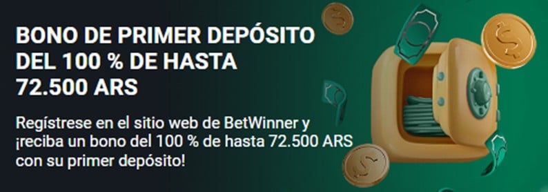 Una de las bonificaciones principales a las que se puede acceder con el código promocional Betwinner es el bono de bienvenida para las apuestas deportivas. Con este bono Betwinner te bonifica el 100% del monto del primer depósito, hasta un máximo de 72.500 ARS. Esto quiere decir que, si hacés un primer depósito de 10.000 ARS, recibirás 10.000 ARS más y tendrás un total de 20.000 pesos disponibles para apostar.